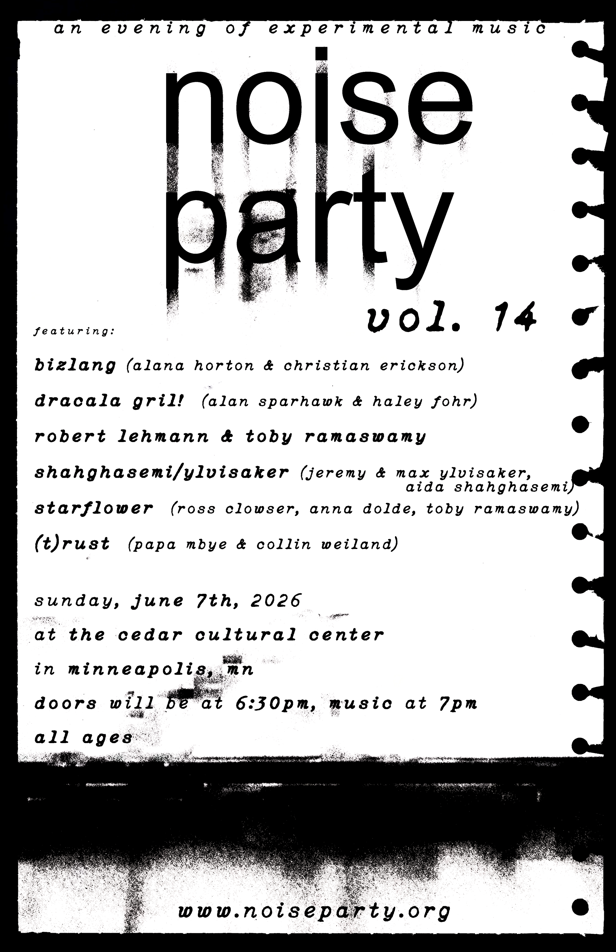 Noise Party, now on its 14th edition, is the premiere Minneapolis-based experimental music series that highlights the best established and underground artists from numerous musical backgrounds. Each Noise Party event is meticulously curated to offer the most coherent yet diverse batch of music to create an atmosphere like you’ve never experienced before. Noise Party is not a traditional concert, as artists will play back to back in batches of three, with an intermission dividing the night. Accompanied by live analog-based visuals by Shane Donahue, Noise Party is an immersive, one of a kind audio-visual experience that can only be experienced in a live setting. Each Noise Party is a completely different experience from the last, so come and see what Volume 14 has to offer Sunday, June 7th at the Cedar.
